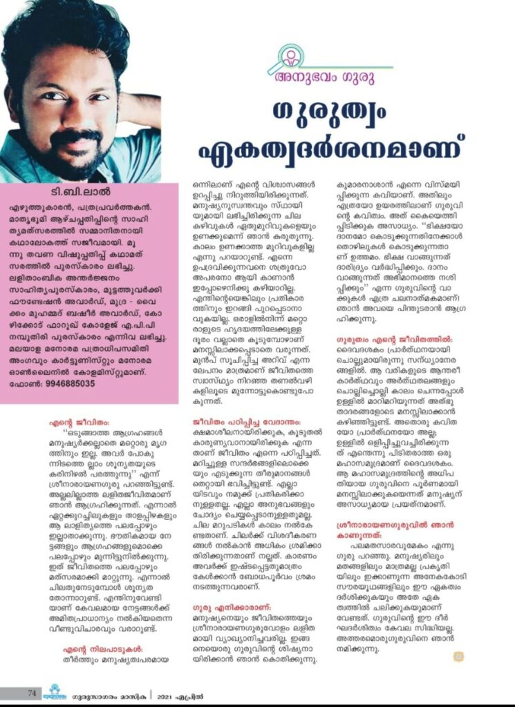 മനുഷ്യനേയും ജീവിതത്തേയും ശ്രീനാരായണഗുരുവിനെപ്പോലെ ഇത്രയും ലളിതമായി വ്യാഖ്യാനിച്ചവരില്ല. ഇങ്ങനെയൊരു ഗുരുവിന്റെ ശിഷ്യനായിരിക്കാൻ ഞാൻ കൊതിക്കുന്നു.. കുമാരനാശാൻ എന്നെ വിസ്മയിപ്പിച്ച കവിയാണ്. ഗുരുവിന്റെ കവിത അതിലും എത്രയോ ഉയരത്തിലാണ്. ആ ഗിരിശൃംഘത്തിലെത്തിച്ചേരുക അസാധ്യം. മനുഷ്യജീവിതം എല്ലാലത്തും അന്തസോടെ എങ്ങനെ മുന്നോട്ടു പോകണമെന്നു ഗുരു പറഞ്ഞു വയ്ക്കുന്നു.ഉദാഹരണത്തിനു തൊഴിലിനെപ്പറ്റിയുള്ള ഈ ഗുരുവചനം നോക്കൂ. : ‘ഭിക്ഷയോ ദാനമോ കൊടുക്കുന്നതിനേക്കാൾ തൊഴിലുകൾ കൊടുക്കുന്നത് ഉത്തമമാണ്. ഭിക്ഷ വാങ്ങുന്നത് ദാരിദ്ര്യം വർദ്ധിപ്പിക്കും. ദാനം വാങ്ങുന്നത് അഭിമാനം നശിപ്പിക്കും.’എത്ര ചലനാത്മകമാണ് ഗുരുവിന്റെ വാക്കുകൾ.