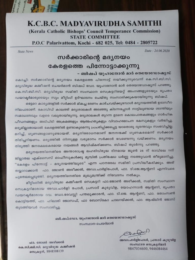 ഫാ.ജോൺ അരീക്കൽ (KCBC മദ്യവിരുദ്ധ കമ്മീഷൻ സെക്രട്ടറി) അഡ്വ.ചാർളി പോൾ, പ്രസാദ് കുരുവിള (സംസ്ഥാന സെകട്ടറിമാർ) – ജൂൺ 23 ന് സംസ്ഥാന ചെയർമാൻ ബിഷപ് ഡോ.യൂഹാനോൻ മാർ തെയോ ഡോഷ്യസ് പിതാവ് വിളിച്ചുകൂട്ടിയ സംസ്ഥാന സെക്രട്ടറിയേറ്റ് അംഗങ്ങളുടെയും രൂപത ഡയറക്ടർമാരുടെയും യോഗത്തിൽ തീരുമാനിച്ചത്.