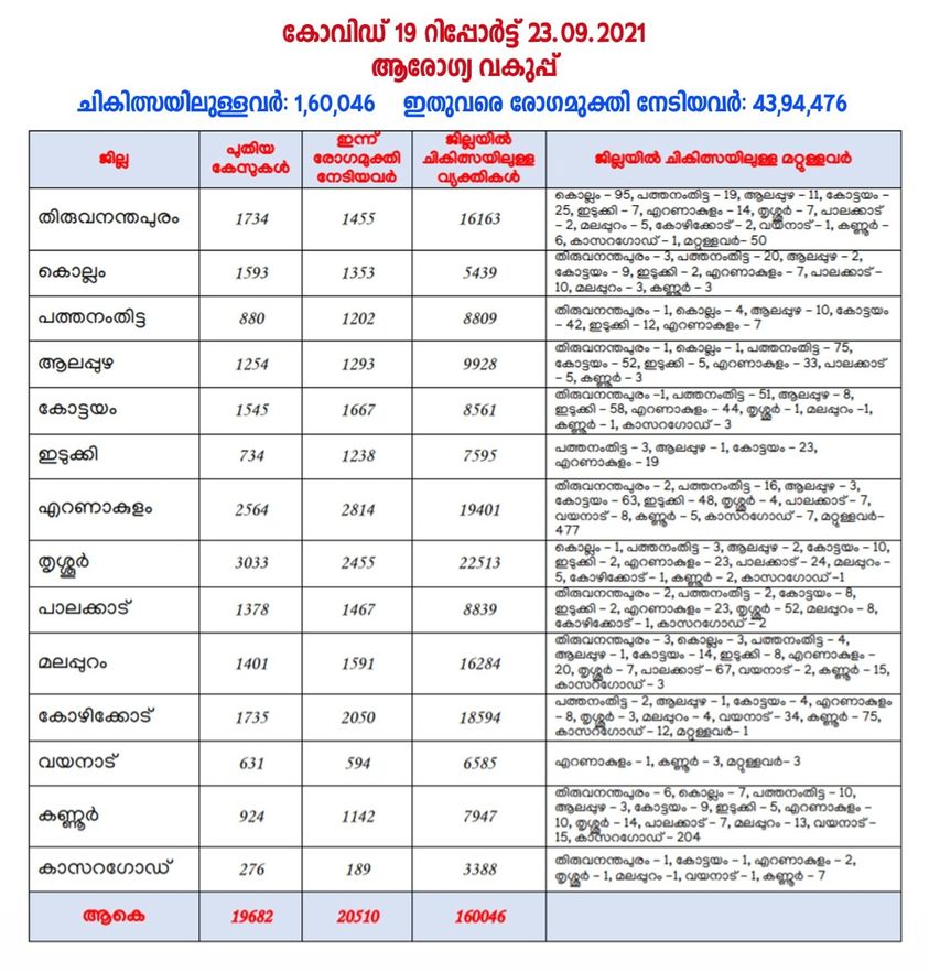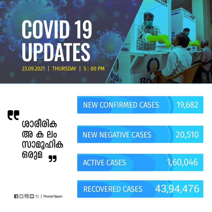 വ്യാഴാഴ്ച 19,682 പേര്ക്ക് കോവിഡ്-19 സ്ഥിരീകരിച്ചു; രോഗമുക്തി നേടിയവര് 20,510