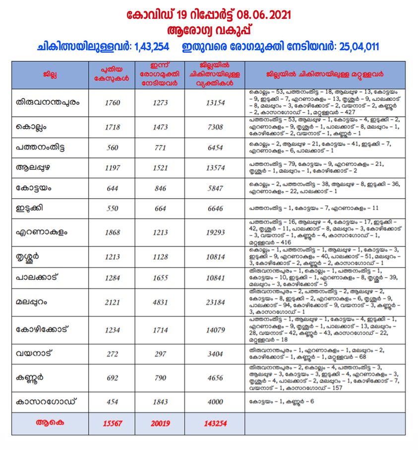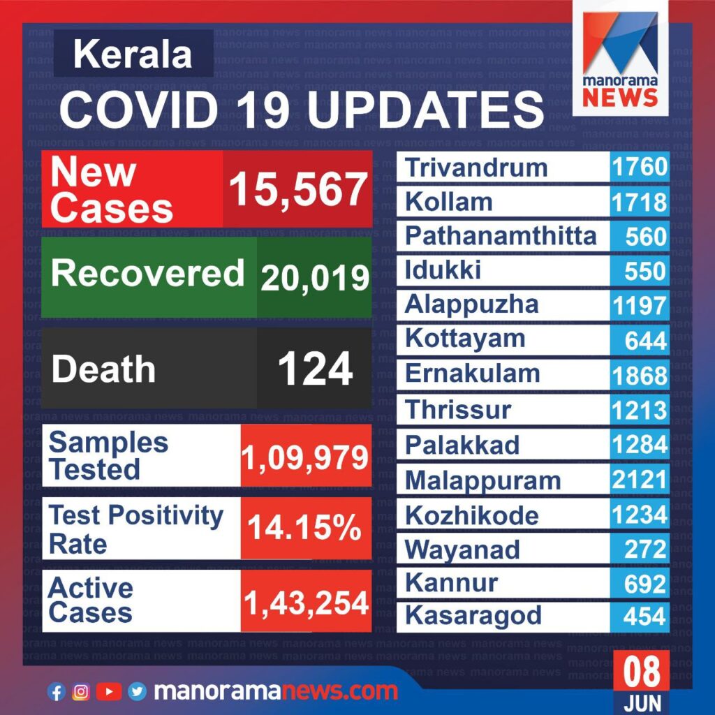 കഴിഞ്ഞ 24 മണിക്കൂറിനിടെ 1,09,979 സാമ്പിളുകളാണ് പരിശോധിച്ചത്. ടെസ്റ്റ് പോസിറ്റിവിറ്റി നിരക്ക് 14.15 ആണ്. റുട്ടീൻ സാമ്പിൾ, സെന്റിനൽ സാമ്പിൾ, സിബി നാറ്റ്, ട്രൂനാറ്റ്, പി.ഒ.സി.ടി. പി.സി.ആർ., ആർ.ടി. എൽ.എ.എം.പി., ആന്റിജൻ പരിശോധന എന്നിവ ഉൾപ്പെടെ ഇതുവരെ ആകെ 2,06,88,146 സാമ്പിളുകളാണ് പരിശോധിച്ചത്.കഴിഞ്ഞ ദിവസങ്ങളിലുണ്ടായ 124 മരണങ്ങളാണ് കോവിഡ് മൂലമാണെന്ന് സ്ഥിരീകരിച്ചത്. ഇതോടെ ആകെ മരണം 10,281 ആയി.രോഗം സ്ഥിരീകരിച്ചവരിൽ 85 പേർ സംസ്ഥാനത്തിന് പുറത്ത് നിന്നും വന്നവരാണ്. 14,695 പേർക്ക് സമ്പർക്കത്തിലൂടെയാണ് രോഗം ബാധിച്ചത്. 712 പേരുടെ സമ്പർക്ക ഉറവിടം വ്യക്തമല്ല. മലപ്പുറം 2070, എറണാകുളം 1830, തിരുവനന്തപുരം 1681, കൊല്ലം 1710, പാലക്കാട് 798, കോഴിക്കോട് 1212, തൃശൂർ 1201, ആലപ്പുഴ 1192, കണ്ണൂർ 616, കോട്ടയം 609, പത്തനംതിട്ട 546, ഇടുക്കി 538, കാസർഗോഡ് 445, വയനാട് 247 എന്നിങ്ങനെയാണ് സമ്പർക്കത്തിലൂടെ രോഗം ബാധിച്ചത്.75 ആരോഗ്യ പ്രവർത്തകർക്കാണ് രോഗം ബാധിച്ചത്. കണ്ണൂർ 18, തിരുവനന്തപുരം 9, എറണാകുളം, വയനാട് 8 വീതം, തൃശൂർ, കാസർഗോഡ് 7 വീതം, കൊല്ലം 6, പാലക്കാട് 4, പത്തനംതിട്ട 3, കോട്ടയം 2, ഇടുക്കി, മലപ്പുറം, കോഴിക്കോട് 1 വീതം ആരോഗ്യ പ്രവർത്തകർക്കാണ് രോഗം ബാധിച്ചത്.രോഗം സ്ഥിരീകരിച്ച് ചികിത്സയിലായിരുന്ന 20,019 പേർ രോഗമുക്തി നേടി. തിരുവനന്തപുരം 1273, കൊല്ലം 1473, പത്തനംതിട്ട 771, ആലപ്പുഴ 1521, കോട്ടയം 846, ഇടുക്കി 664, എറണാകുളം 1213, തൃശൂർ 1128, പാലക്കാട് 1655, മലപ്പുറം 4831, കോഴിക്കോട് 1714, വയനാട് 297, കണ്ണൂർ 790, കാസർഗോഡ് 1843 എന്നിങ്ങനേയാണ് രോഗമുക്തിയായത്. ഇതോടെ 1,43,254 പേരാണ് രോഗം സ്ഥിരീകരിച്ച് ഇനി ചികിത്സയിലുള്ളത്. 25,04,011 പേർ ഇതുവരെ കോവിഡിൽ നിന്നും മുക്തി നേടി.സംസ്ഥാനത്തെ വിവിധ ജില്ലകളിലായി 6,12,155 പേരാണ് ഇപ്പോൾ നിരീക്ഷണത്തിലുള്ളത്. ഇവരിൽ 5,79,163 പേർ വീട്/ഇൻസ്റ്റിറ്റിയൂഷണൽ ക്വാറന്റൈനിലും 32,992 പേർ ആശുപത്രികളിലും നിരീക്ഷണത്തിലാണ്. 2510 പേരെയാണ് പുതുതായി ആശുപത്രിയിൽ പ്രവേശിപ്പിച്ചത്.