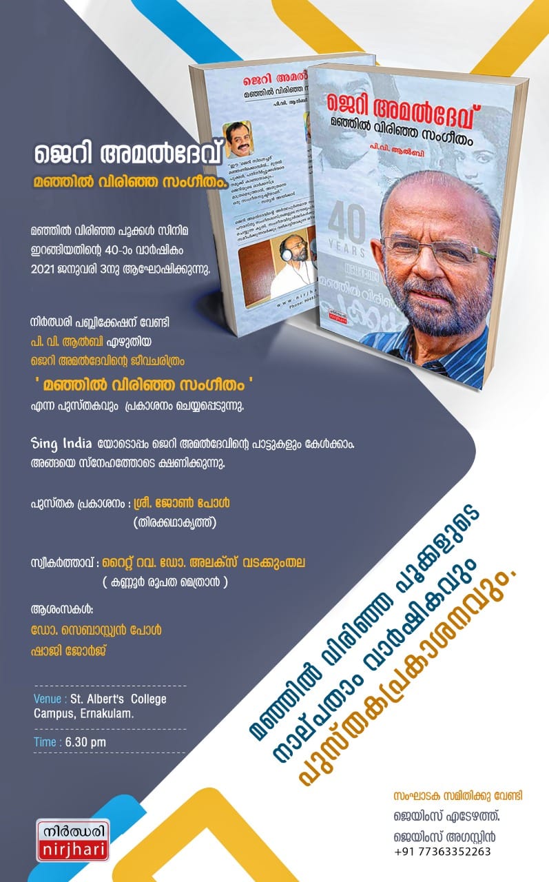 മഞ്ഞിൽ വിരിഞ്ഞ പൂക്കൾ സിനിമയുടെ നാൽപതാം വാർഷികമാണ്.|ജെറി അമൽദേവ് നയിക്കുന്ന സംഗീതസന്ധ്യ. | ജീവചരിത്രത്തിൻ്റെ പ്രകാശനം|നാളെ 6.30 P.M.