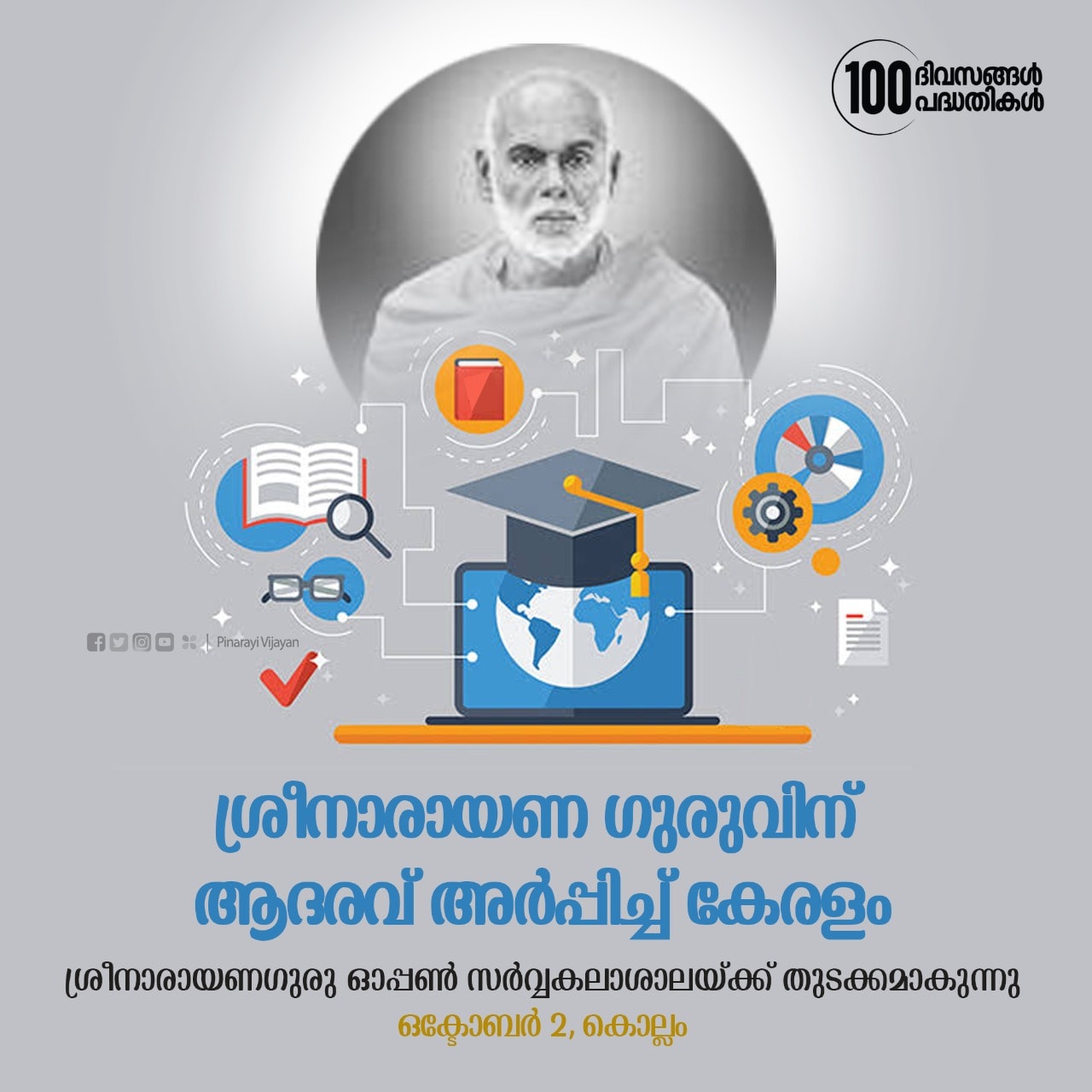ശ്രീനാരായണ ഗുരുവിനോടുള്ള ആദരവായി കൂടി അത് നിറവേറ്റപ്പെടുകയാണ്. സംസ്ഥാനത്തെ ഓപ്പൺ സർവ്വകാലാശാലയ്ക്ക് ഒക്ടോബർ രണ്ടിന് തുടക്കം കുറിക്കും. ശ്രീനാരായണ ഗുരു ഓപ്പൺ സർവ്വകലാശാലയുടെ ആസ്ഥാനം കൊല്ലമാണ്. അതിനുള്ള പ്രവത്തനങ്ങൾ നടന്നുവരുന്നു. വിദൂരവിദ്യാഭ്യാസ പഠനം കേന്ദ്രീകൃതമാക്കി ഓപ്പൺ യൂണിവേഴ്സിറ്റിക്ക് കീഴിലേക്ക് മാറ്റാനാണ് ഇപ്പോൾ ആലോചിച്ചിരിക്കുന്നത്. വിദ്യാഭ്യാസ മേഖലയെ കൂടുതൽ ശക്തിപ്പെടുത്താൻ ഈ ഓപ്പൺ സർവ്വകലാശാലക്ക് സാധിക്കും എന്ന കാര്യത്തിൽ സംശയമില്ല.