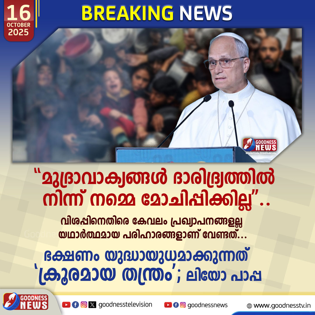 പോപ്പ് ലിയോ പതിനാലാമൻ (Pope Leo XIV) എഫ്എഒ (FAO) ആസ്ഥാനത്തെ 80-ാം വാർഷിക സന്ദർശന വേളയിൽ, ലോകമെമ്പാടുമുള്ള പട്ടിണിക്ക് എതിരെ യഥാർത്ഥ പരിഹാരങ്ങൾ ആവശ്യപ്പെട്ടു , “മുദ്രാവാക്യങ്ങൾ ദാരിദ്ര്യത്തിൽ നിന്ന് ആരെയും കരകയറ്റില്ല” എന്ന് തുറന്നുപറഞ്ഞ അദ്ദേഹം .