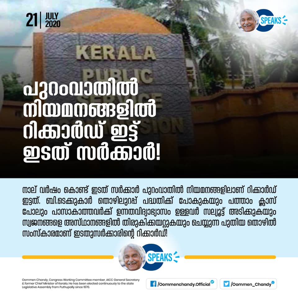 പത്താംക്ലാസ് പോലും പാസാകാത്തവര്ക്ക് ഉന്നതവിദ്യാഭ്യാസം ഉള്ളവര് സല്യൂട്ട് അടിക്കുകയും സ്വജനങ്ങളെ അസ്ഥാനങ്ങളില് തിരുകിക്കയറ്റുകയും ചെയ്യുന്ന പുതിയ തൊഴില് സംസ്കാരമാണ് ഇടതുസര്ക്കാരിന്റെ റിക്കാര്ഡ്!!.-ഉമ്മൻ ചാണ്ടി